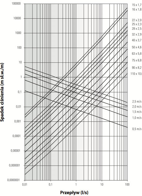 Poniższy wykres obrazuje opór liniowy dla rur PB, przy przyjęciu wartości współczynnika chropowatości równej 0,0015.