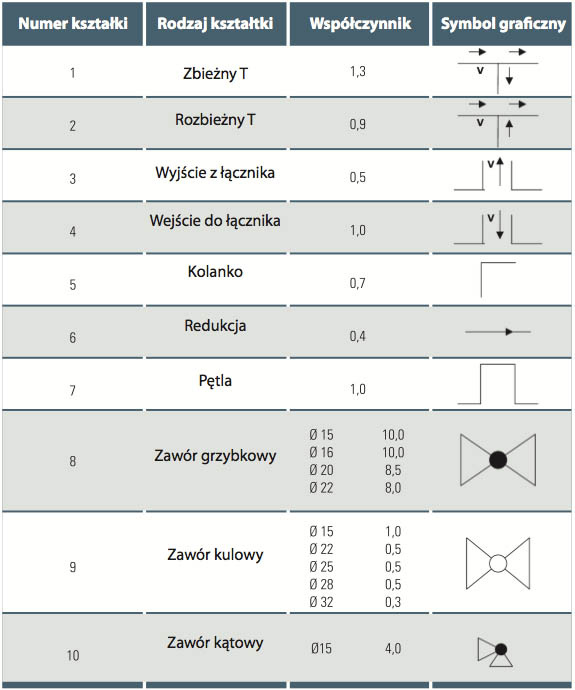 Gdzie współczynnik ζ ma swoją wartość dla odpowiednich elementów armatury, zgodnie z tą tabelą: