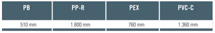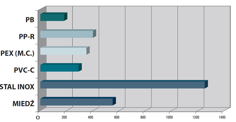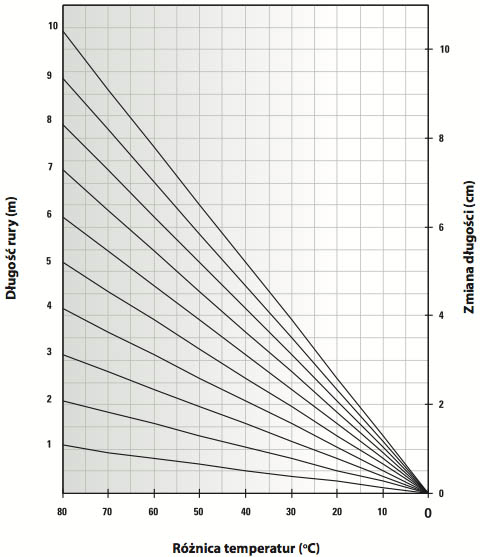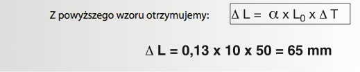 Zatem w przypadku odcinka 10 metrów rury, o średnicy ø 40 i zmianie temperatury o 50°C, długość ramienia elastycznego dla poszczególnych materiałów powinna wynosić:
